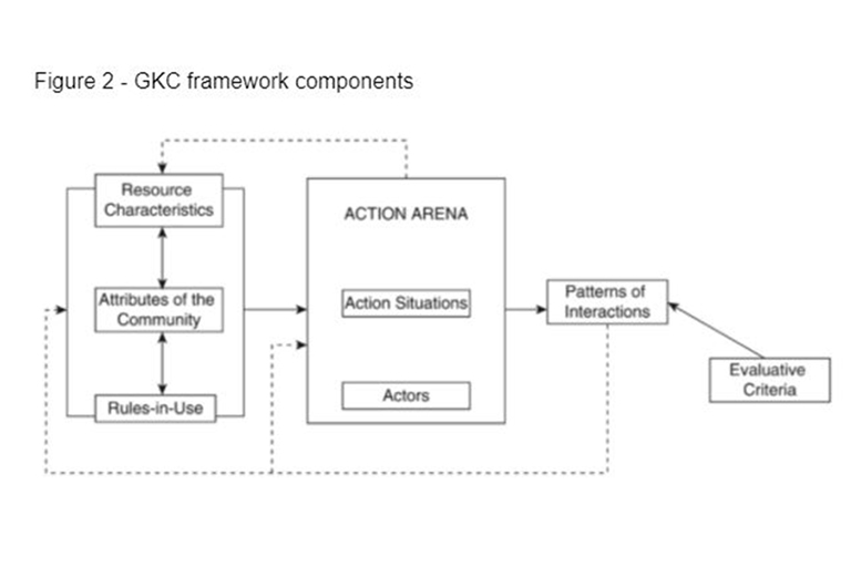 In addition to the components from IAD framework, GKC framework includes resource characteristics as one additional component. The framework also includes the influence from the action arena on resource characteristics.