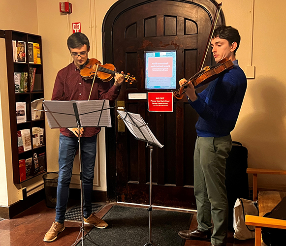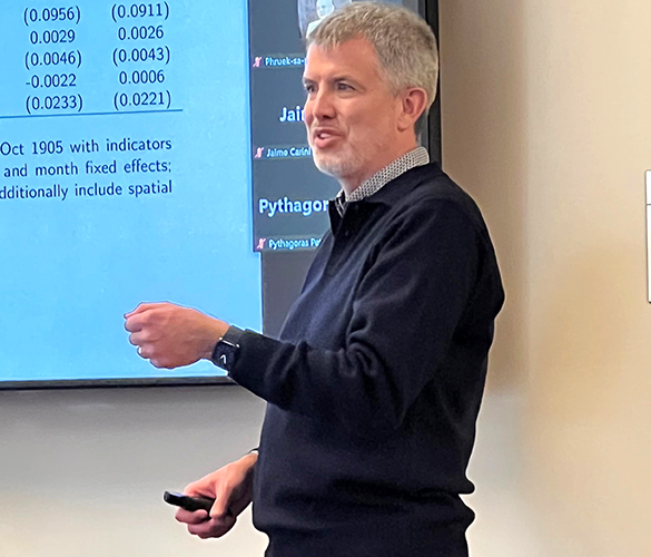 The Vincent and Elinor Ostrom Memorial Lecture was established in 2015 to honor and celebrate the life and work of the Ostroms.  The 2022 lecture was provided by Scott Gehlbach, Professor, Department of Political Science and Harris School of Public Policy, at the University of Chicago.  A political economist and comparativist, Gehlbach’s work is motivated by the contemporary and historical experience of Russia, Ukraine, and other postcommunist states. His topic for the Ostrom Memorial Lecture was “Governing the Autocracy: The Nature of Institutions for Authoritarian Rule”.  The evening was very well attended by both new Workshoppers and those who knew Vincent and Lin for many years.  After the lecture and discussion, a wonderful reception ensued with a four foot charcuterie grazing board and Jacobs School of Music Violin and Viola duet playing in the foyer (Ross McIntosh and Tom Mathias).