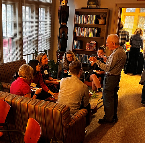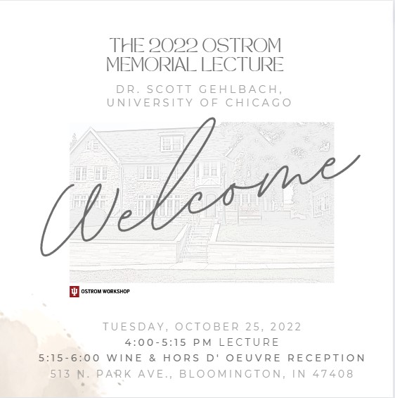 The Vincent and Elinor Ostrom Memorial Lecture was established in 2015 to honor and celebrate the life and work of the Ostroms.  The 2022 lecture was provided by Scott Gehlbach, Professor, Department of Political Science and Harris School of Public Policy, at the University of Chicago.  A political economist and comparativist, Gehlbach’s work is motivated by the contemporary and historical experience of Russia, Ukraine, and other postcommunist states. His topic for the Ostrom Memorial Lecture was “Governing the Autocracy: The Nature of Institutions for Authoritarian Rule”.  The evening was very well attended by both new Workshoppers and those who knew Vincent and Lin for many years.  After the lecture and discussion, a wonderful reception ensued with a four foot charcuterie grazing board and Jacobs School of Music Violin and Viola duet playing in the foyer (Ross McIntosh and Tom Mathias).
