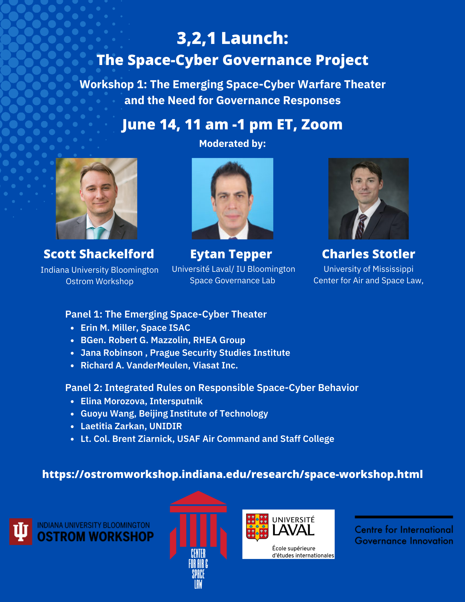 This project is a cooperation between the Laval University Graduate School of international Studies, the Centre for International Governance Innovation (CIGI), the Ostrom Workshop at Indiana University, Bloomington, and the Center for Air and Space Law at the University of Mississippi School of Law.
